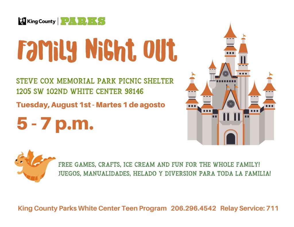 King County Parks was thrilled to host families for a quest worthy Night Out at the Playground Picnic Shelter at Steve Cox Memorial Park (1321 SW 102nd St 98146.) This year’s activities ran between 5-7pm and featured Fairy Tale themed activities, crafts, pinatas and carnival games. Hotdogs and ice cream treats were on hand. Guests of honor included North Highline Fire Department, King County Parks Patrol, the WC KCSO Storefront, Librarian Destinee from the White Center Library, and a castle full of White Center Teen Program Recreation Aides. And yes, there were dragons.