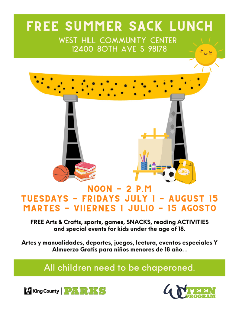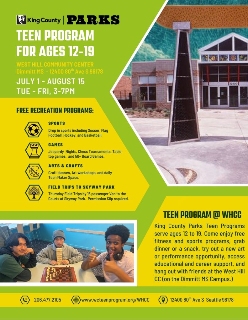 If you’ve been following our social media (which you should!), you might’ve heard that King County reopened West Hill Community Center in Skyway this summer! We’re running a Teen Drop-In program just like the one at Steve Cox Memorial Park, from 3-7 PM on Tuesdays-Fridays until August 15th.