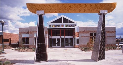 Stainless steel, powdercoated aluminum and galvanized steel, lighting and plants. West Hill Community Center in Skyway, WA. Illuminated archway, mosaic inserts (Benson Shaw), glasswork (Mauricio Robalino) and grating frame the plaza entry and reinforce the concept of our arrival from ‘different worlds’ for a diverse neighborhood population. Project was part of a neighborhood rehabilitation that transformed a dilapidated property into a safe gathering place for teens.