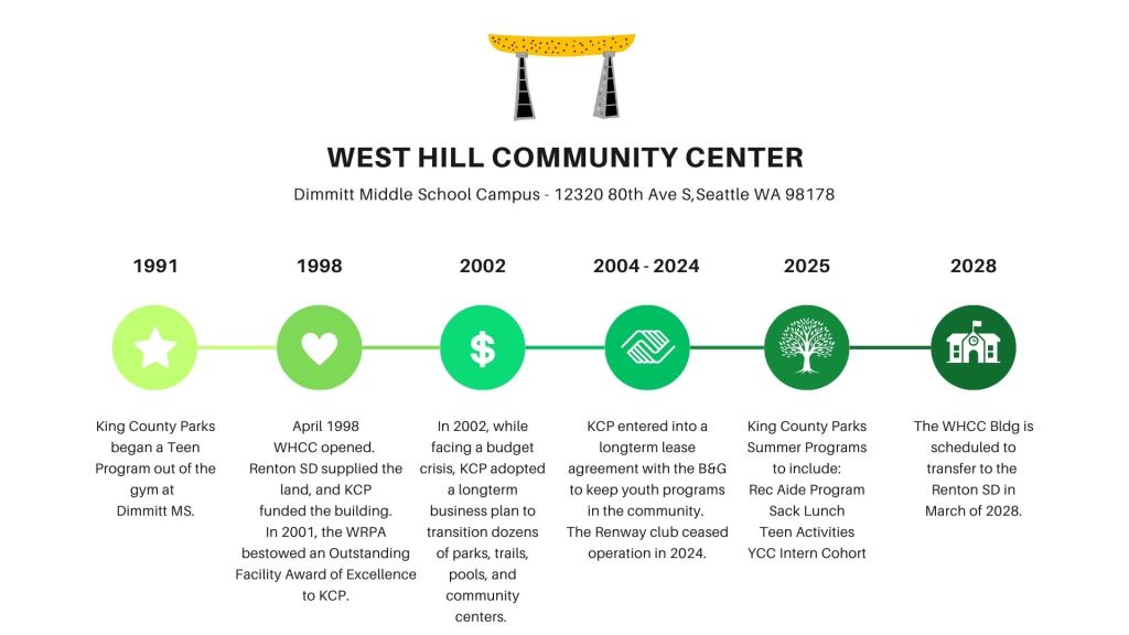 When the building went up for grabs, the Boys & Girls Club offered to pick up where Parks left off so that the local community would still have access to recreation programs. They called their program the “Renway” club – halfway between Renton and Skyway. For 20 years (2004-2024), they operated all kinds of programs for youth out of the West Hill Community Center building.