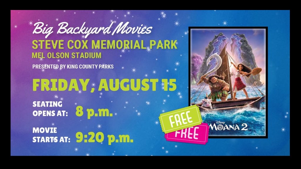 22. MOVIE NIGHT at SCMP King County Parks and the White Center Teen Program were pleased to host an outdoor Movie in Mel Olsen Stadium at Steve Cox Memorial Park on Friday, August 15th. The WCTP Rec Aides surveyed community members at 20 different community events to gauge interest in eight films including Beetle Juice 2, Captain America: Brave New World, Despicable Me 4, Inside Out 2, Moana 2, Mufasa the Lion King , Sonic the Hedgehog 3, and Wicked. After 1071 votes counted, the top film with 24% of the votes was (insert drumroll here) … MOANA 2! The Rec Aides tabled at Movie Night offering Moana themed crafts to accompany the film.