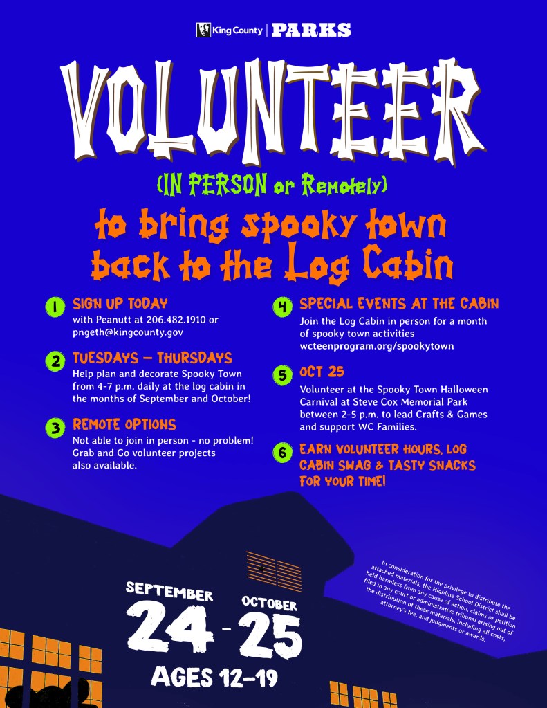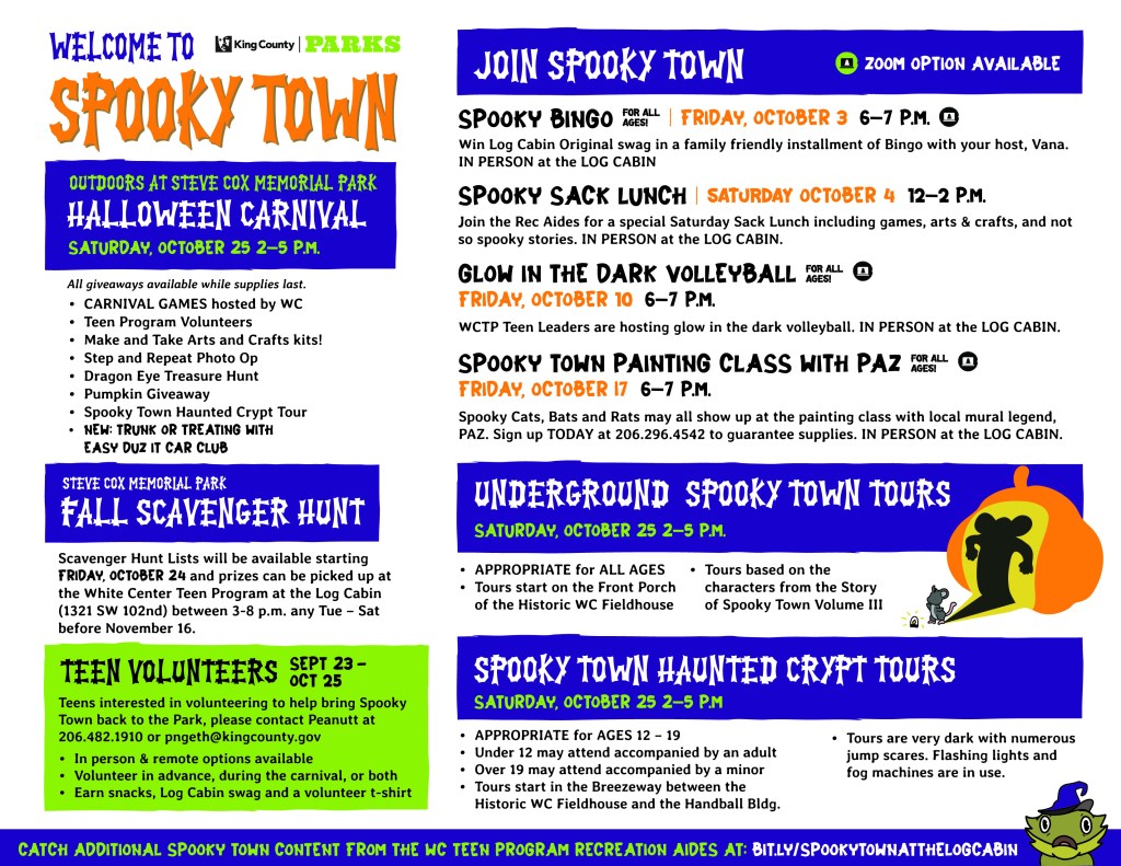 - Spooky Town Grab and Go crafts available for pick up at the Carnival as well as from the White Center Teen Program at the Log Cabin (1321 SW 102nd) between 3-8pm any Tue – Sat. DIY craft tutorials available at http://bit.ly/SpookyTownattheLogCabin